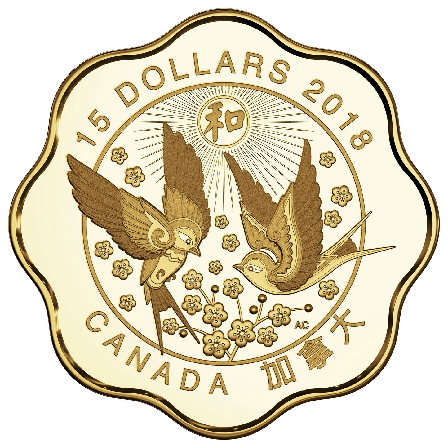 On your fully gold-plated reverse, the stylized image by Aries Cheung centres on a pair of swallows, a beloved bird that represents harmony—in love, in families and the community, and in nature itself. This migratory bird is traditionally revered as a symbol of spring, thus it is shown with plum blossoms, whose five petals symbolize the Five Blessings: longevity, fortune, health, virtue and dying a natural death. The birds and flowers bask in the warming rays of the sun, which bears the Chinese characters for "harmony". The face value "15 DOLLARS", the year "2018", the word "CANADA" and the Chinese characters for "CANADA" are all engraved within the outer band that frames the image field. The gold-plated obverse features the effigy of Her Majesty Queen Elizabeth II by Susanna Blunt.