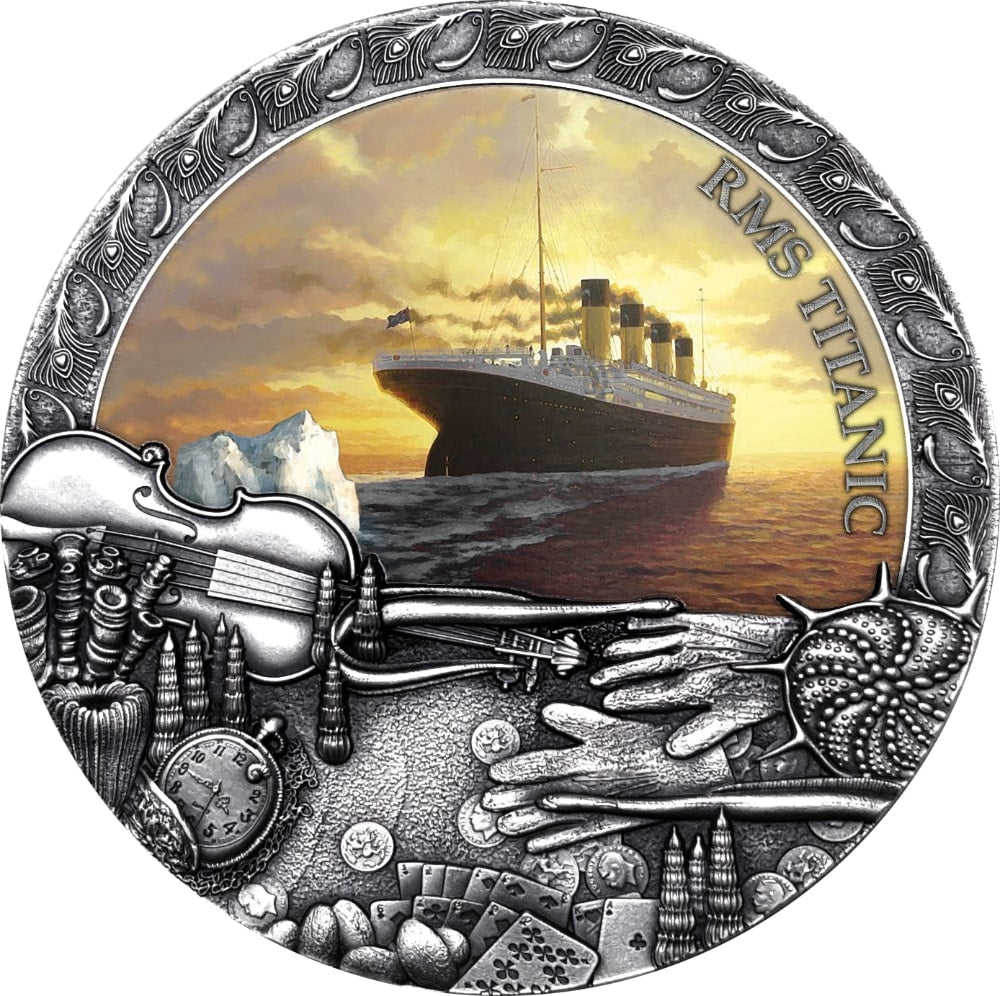 The coin features the famous Titanic – the biggest, most luxurious and safest ocean liner ever built, which is racing across the frigid North Atlantic and is inevitably going to hit an iceberg.