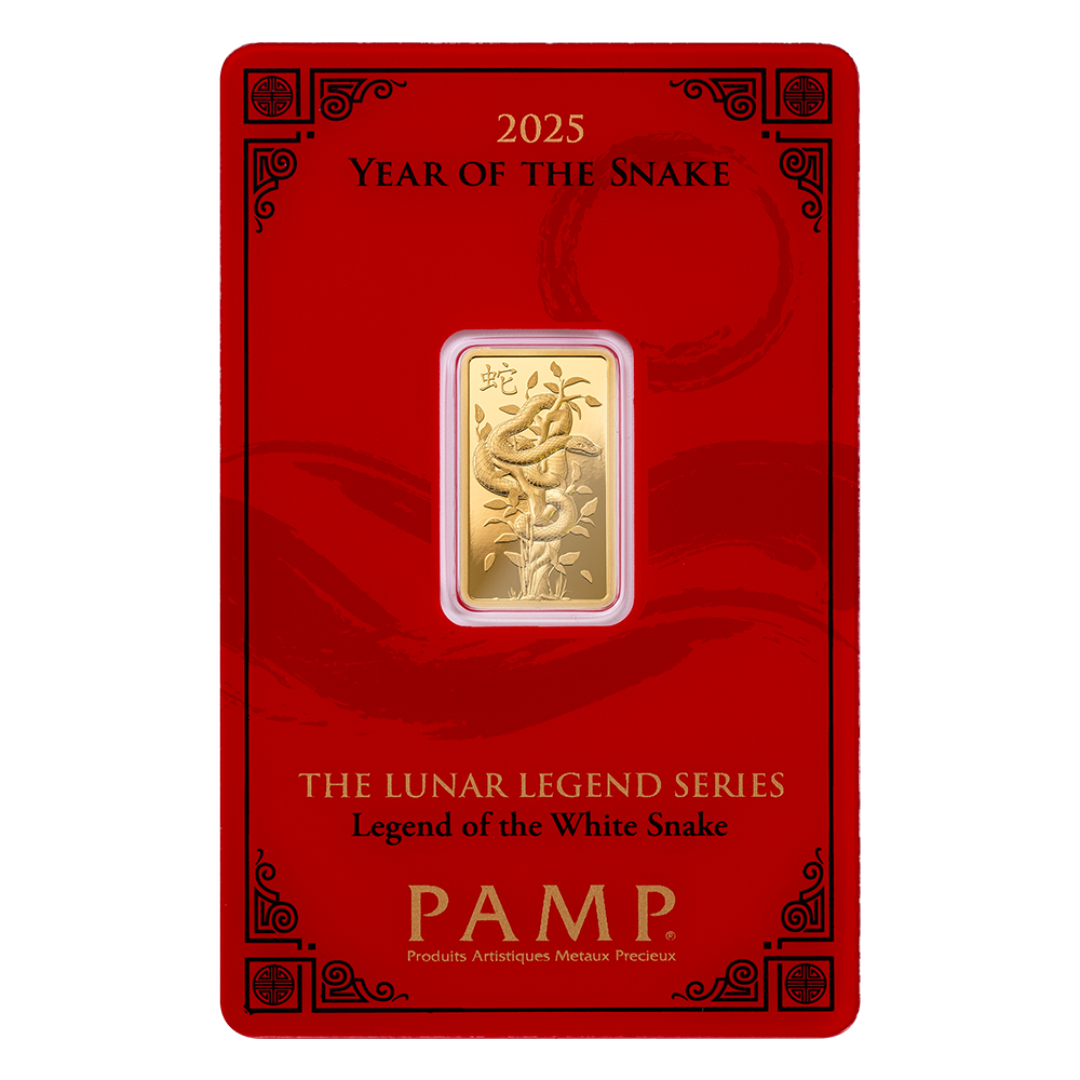 This bar is the second issue in a series of minted bullion which tells the legendary stories related to the 12 animals of the Chinese Lunar Calendar. In 2025 we tell the story of the White Snake. After a thousand years of Taoist training, the white snake Bai Suzhen was granted the power to become a human woman. She then searched for Xu Xian to repay him for his bravery that saved her in a past life. They soon fell in love and married. But the monk Fahai discovered her identity and convinced Xu Xian to trick his wife into revealing her true form, and he died of shock. Desperate, Bai Suzhen stole an immortal herb from Heaven and revived him. Fahai found the couple and imprisoned Bai Suzhen in a fortress pagoda where she gave birth to a son. Once grown, he freed his mother, and the family was happily reunited. Housed in a brilliant red CertiPAMP™ assay card accompanied by a gift sleeve this 5g 999.9 pure gold bar has a beautiful proof-like finish and is individually serialized.