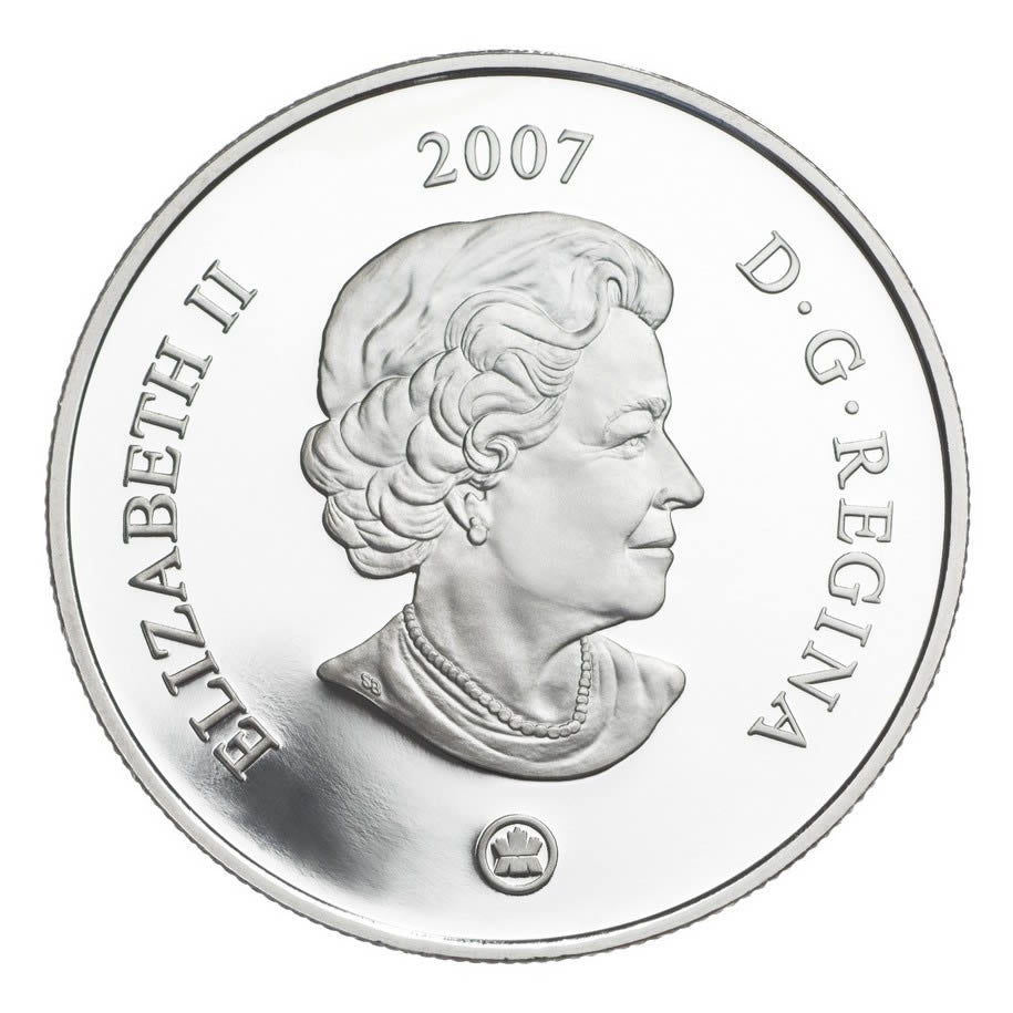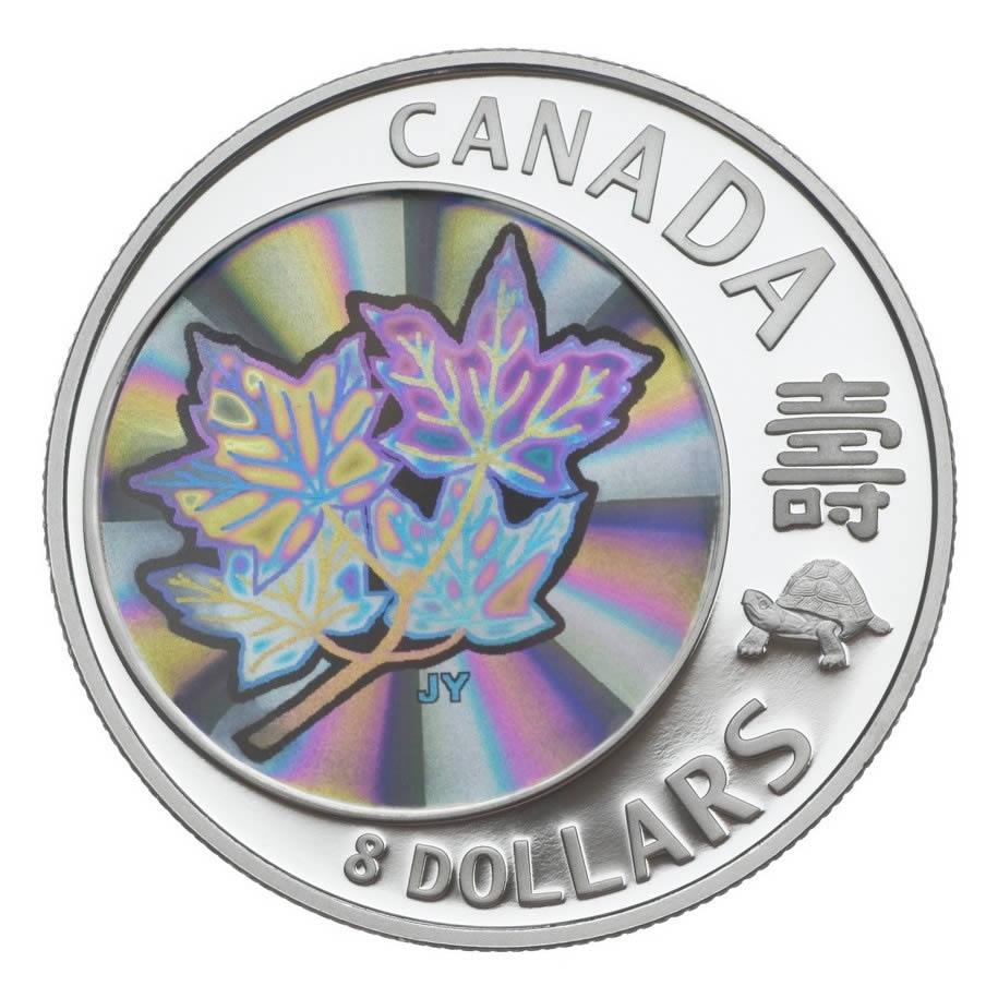 2007 Canadian $8 Maple of Long Life Proof Silver & Hologram Coin comes encapsulated in Royal Canadian Mint maroon clamshell case, black beauty sleeve and Certificate of Authenticity.